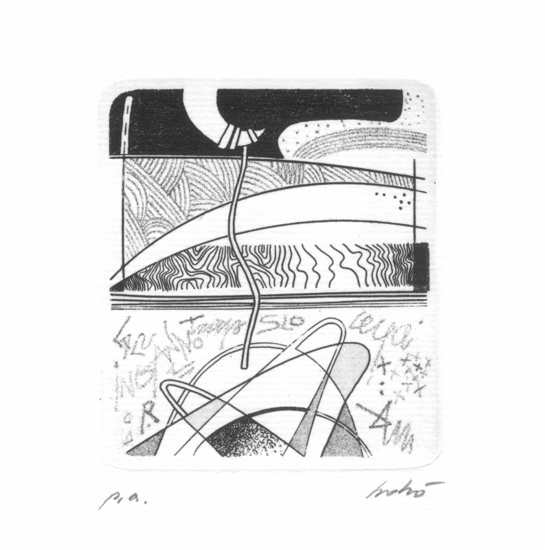 Da: "Quattro giochi per le notti di luna", incisioni di Antonio Bobò e frammento di Ugo Garzelli, ed. della Mela, 1989.