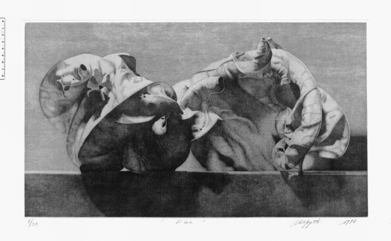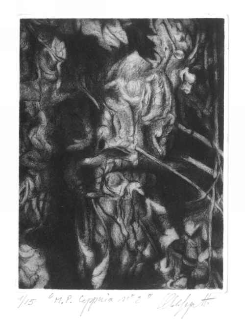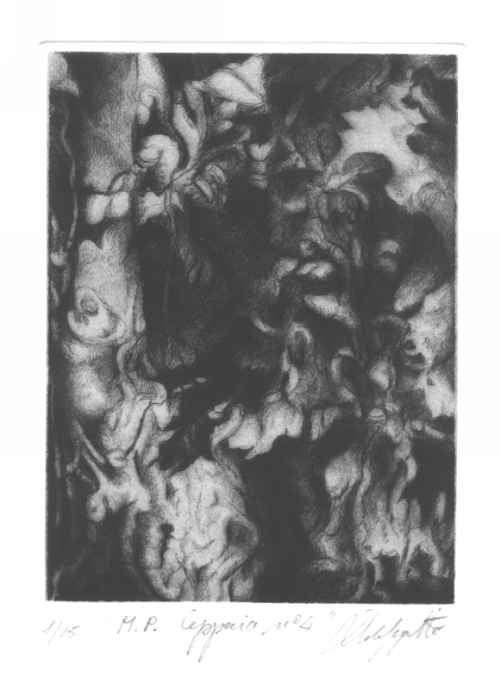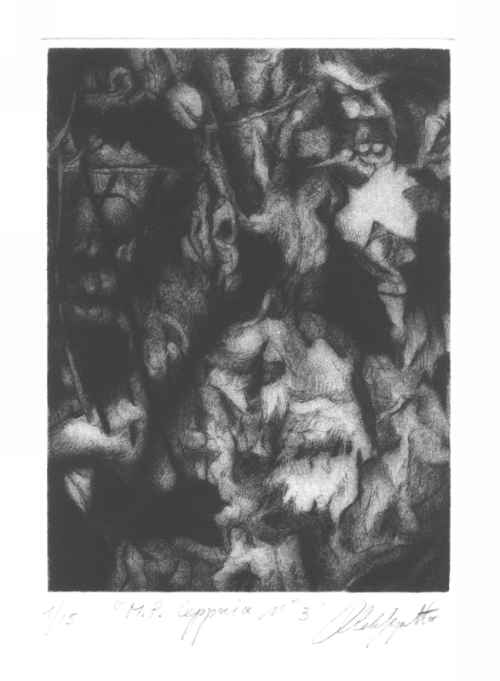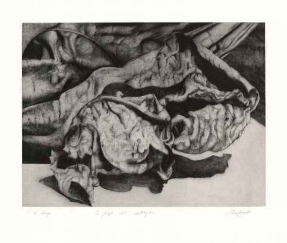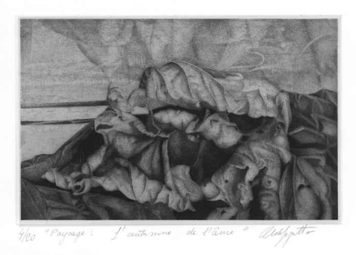 I soggetti delle sue incisioni, le foglie morte, diventano un motivo strumentale all'indagine della luce, vera protagonista, nel suo rapporto con gli aggrovigliati e informi tessuti post-vegetali.